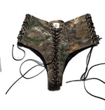 These hotpants are crafted from a durable military fabric featuring the original realtree print. They showcase my signature infinity lacings, wrapping from the front all the way to the back. Designed with a lower-waisted cut for a cheeky look, they are fully lined in black satin for extra comfort. These hotpants offer minimal stretch and feature adjustable lacings on both sides for that perfectly laced up fit.